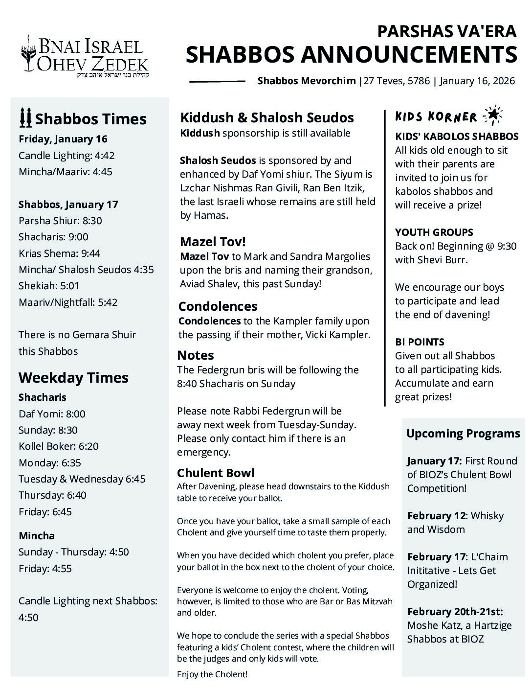Shabbos, January 17