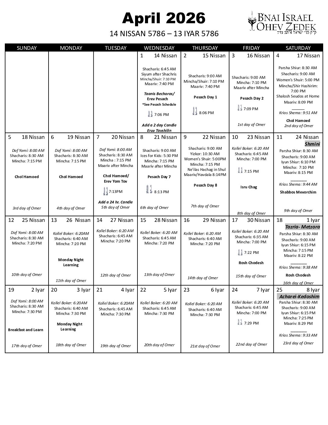*Please see Pesach Schedule for additional times.